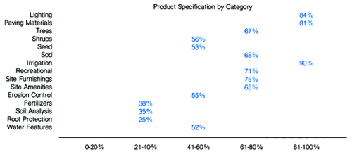 Landscape architecture is a spec market and there is a good reason for that title. When asked, “Which products do you specify by either brand name or individual product,” only three of the 15 categories we asked about ended up with less than 50 percent. Irrigation beat out site furnishings this year to become the most specified item on our list. Here is how they fared.
