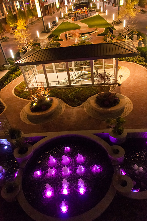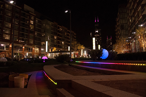 When real estate developer McCaffery Interests acquired The Roosevelt Collection, an existing multiuse residential and retail development in Chicago's South Loop neighborhood, an extensive renovation and update for the 1.3 million square foot complex began. As part of the revitalization efforts, the need for a signature feature that would serve the residents of the Roosevelt Collection's luxury lofts and attract attention to the development from the street was identified. "Mr. McCaffery came to us after a visit to Europe with the instruction to "humanize' the landscape of the Roosevelt Collection," said Lily Mueller-Marcus, chief landscape designer at Private Gardens, Public Places, a Chicago-based design firm. "He was inspired by the amount of flowers and attention to beautifying public space that seems to come inherently to Europeans. We took this as a cue. Our design was inspired by the elegance and majesty of French gardens and public places." Jardins du Luxembourg in Paris, the gardens of Versailles and the flower market in Nice were particularly influential. "Since the architecture of the Roosevelt Collection is contemporary, we took elements from these European gardens we so love and updated them," Mueller-Marcus said. The team re-imagined the entryway and central courtyard as a sleek plaza with manicured landscaping, outdoor seating and elegant fountains. Lightswitch Architectural created a dramatic nighttime identity for the plaza that complements the bustling urban surround. White pedestrian and landscape lighting, including vertical light poles, help to orient visitors, while color-changing LED lighting creates a dramatic nighttime identity for the plaza. Using a variety of digital rendering tools, including a combination of Sketchup, After Effects & Photoshop, Lightswitch turned the architect's renderings into animated video clips that made the colorful lighting concept come to life for the client. The vibrant LED lighting met the client's wish to transform the plaza into a nighttime destination for residents and shoppers alike. "We used color-changing LED digital signage and glowing balls that change color in coordination with the RGB fountain lighting," said Avraham Mendall Mor, partner at Lightswitch Architectural. The new and existing LED lighting are now controlled from a D3 Media controller and Pharos Controller, via Knet2 protocol over Cat6 or fiber optic cable. The main controller – one of three control racks installed on site – is located in the basement under Roosevelt Street near the maintenance office. Each area of the project has a different conceptual design in the form of a simple abstract pattern of shape and color. These patterns resemble the design of high fashion fabric patterns. The pattern for the playground beds, for example, is based on the swirling prints of Emilio Pucci. The interlacing diamond shapes of the pattern for the fire pit and ramp beds are reminiscent of the motifs of the Art Deco movement. Once these abstract designs were hand-drawn in colored pencil, the plant list was developed according to flower and foliage color, height, texture and bloom time. The repeated element of the curlicue evergreen hedges is an established concept in French gardens, providing structure and a yearlong presence in the beds, which are highlighted by seasonal bursts of color. The sinuous hedges are a unifying element throughout the different areas of the space, and allow for planting both in front of and behind the line of yews or boxwood, creating an illusion of depth even in narrow beds. Another request of Mr. McCaffery was for a feature that would draw patrons back to the Roosevelt Collection, visit after visit. The idea for a koi pond came from a desire to make an attraction at the center of the space that would delight all ages. After a visit to the huge koi pond in the historic Union Station in St. Louis, Missouri, the design team decided that this dynamic water feature was perfect for the centerpiece of this park-like space. "We were tasked with making the space a "knockout,'" Mor said. The team drew further inspiration from the warming allure that nighttime lighting brings to the plazas of Europe. "After seeing the Roosevelt Collection in person in August 2011, the need for alluring lighting was one of the things we stressed most to Mr. McCaffery and the Antunovich architects," Mor added. "Specifically, we addressed the large white globe lights installed at the entrance by playing off their "egg" nature and creating a "nest" around them using dogwood and perennial grasses." Another special set of landscape elements was the fire pits, which give a sense of enclosure and separation from the busy roadways. Tall hedges were incorporated to provide a botanical wall around the outdoor living rooms. The plant design was installed on mounded soil beds. There were both climatic and logistical conditions that made this project challenging. The site can be especially hot and windy, even for those experienced with the extreme conditions of the Chicago climate. The wind is funneled into the space by the outward curved shape of the buildings at its entrance. Sunlight reflects off the glass fa?????ade to such a degree that it becomes a solar oven. Furthermore, since the site was built above an underground parking lot, the design team had to work with extremely narrow and shallow planting beds. For this reason, the weight of the soil and plants also had to be kept to a minimum. The immediacy of the project's schedule became another design obstacle when many of the plants originally specified by the designers had to be substituted for flora more readily available. Some areas were redesigned on site, and others were completed with whatever seasonal plants were available during that season. The 2012 annual plantings were composed strictly of the plants available at the date the team received the design assignment. Thus, the plant list for many areas of the project is co