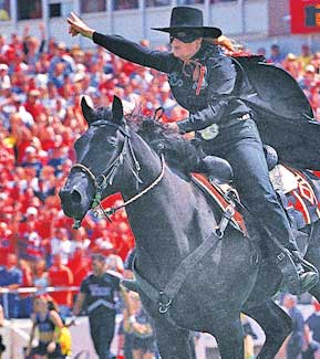 The Masked Rider is one of the mascots of Texas Tech University and its sports teams known as the Texas Tech Red Raiders. It is the oldest of the university’s mascots still in existence today. Originally called “Ghost Rider,” it was an unofficial mascot appearing in just a few games in 1936 before becoming the official mascot for the 1954 Gator Bowl. The Masked Rider has led the team onto the field at nearly every football game since. This was the nation’s first horse ridden mascot used in football games. The Masked Rider dresses from head to toe in black, including a black cowboy hat and a black mask. The only color to the costume is the scarlet rider’s cape. The currently serving horse is also black, though previous horses have been other colors. In 1936 the first rider, George Tate (class of 1937), led the football team onto the football field. Tate, whose identity was kept a secret at the time, was wearing a scarlet satin cape made by the Home Economics Department. He had borrowed a horse from the Tech barn as a prank. Tate was quoted in the Nov. 4, 1984 issue of The Dallas Morning News as saying that Arch Lamb, who was then the head yell leader of the Saddle Tramps, “dreamed up this Red Raider thing.” The prank was pulled a few more times that season but didn’t surface again until the 1950s, when another Tech student was approached about creating a mascot. In 1953 Texas Tech football coach DeWitt Weaver approached a student named Joe Kirk Fulton about becoming The Masked Rider. DeWitt’s Red Raiders were 10-1-0 and headed to Jacksonville, Fla. for the Gator Bowl. At the time, Texas Tech was hoping to be invited to join the new Southwest Conference. All the other teams had a mascot, and it is thought that DeWitt believed creating a mascot for Texas Tech might aid the school’s chances for admission into the conference. Fulton agreed to ride a horse named Blackie in the bowl game. According to reports from those present at the 1954 Gator Bowl, the crowd sat in stunned silence as they watched Fulton and Blackie rush onto the football field, followed by the team. After a few moments of stunned disbelief, the silent crowd burst into cheers. Ed Danforth, a writer for the Atlanta Journal and a press box spectator later wrote, “No team in any bowl game ever made a more sensational entrance.” Wikipedia