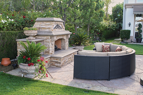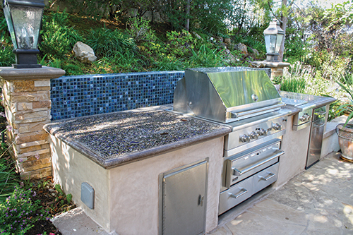 Sweetwater flagstone and concrete that was stamped, textured and colored replaced the old pool deck and patios. Green Scene relied on a number of sub-contractors to assist with the Gunite, steel, plumbing, and electrical Some Fire with that Water The upgrade didn't stop with the water features. A fireplace was custom-built where the play set used to sit. It was constructed of honey ledge stone. Cast-in-place concrete was used for the hearth, mantle and caps. The firebox was made from concrete and built to burn wood. The new cooking and serving counters have cast-in-place concrete countertops hand-seeded with glass chips. Fiber optic cables were fed through the bottom of the counters and attached to individual pieces of glass, which presents quite a sight at night. To finish off their distinctive look, the countertops were ground and polished resulting in a glass-smooth gloss.