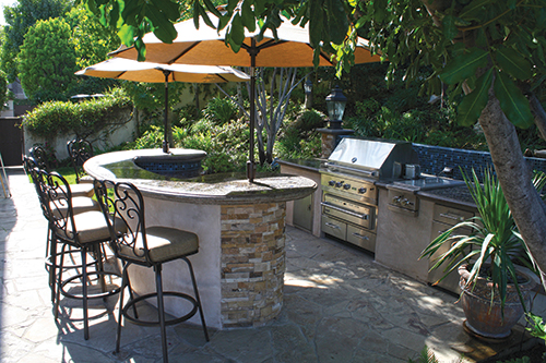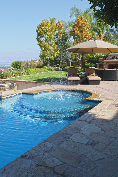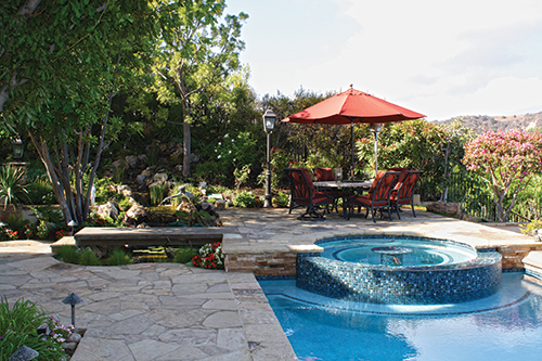 Scott Cohen is the author of nine books about landscaping; has been featured on many national television shows including "Cool Pools," and "Get Out, Way Out!" on HGTV; does professional seminars, training sessions and speaking engagements; and as a certified Expert Witness and Industry Expert with the California Contractors State License Board, regularly serves as a mediator and testifies in cases of alleged outdoor construction defects; yet still finds time to be very hands-on with his landscape company's projects. Case in point is this backyard remodel in Tarzana, Calif. Over the course of six months plus, Cohen's direct involvement in the design and build helped turn a lacking landscape into a rich backyard retreat with multiple tiers. He and his crew from Green Scene Landscaping and Pools were greeted by the sight of concrete patios, a rectangular pool with no spa, an area of grass with a play set, and a run-of-the-mill bar and cooking counter with a small grill. The homeowner had been a fan of Cohen's work on HGTV for a decade and looked forward to the opportunity to work with his company. After designing the remodel and receiving the go-ahead, demolishing the old kicked off the build. A Fortuitous Find A little research revealed that the wrought iron fence at the rear of the property was shy of the property line, and with the HOA's permission, the fence was moved downslope another 16 feet. "It opened up the views completely and gave us the opportunity to convert their old rectangular pool into a vanishing edge pool," states Cohen. To do so, Green Scene worked closely with structural engineer Todd Lacher from Pool Engineering Inc. The team was able to keep part of the pool shell while adding the support structure for the new elements, which besides the spillway, included a lower pool with adjacent seating area in the middle of it, a Baja shelf with integrated fountain on one end of the pool and a raised spa on the other end.