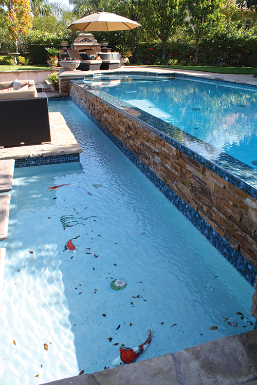 "These are the types of artistic touches that clients are looking for to make their yards different from everyone else's," Cohen says. For that reason, he doesn't like to install tile countertops anymore. And for another reason, delamination, granite countertops are not favored. This is further explored in "Outdoor Kitchen Design Wookbook," which is distributed through Amazon as are all his books. The appliances are from Viking. The custom backsplash is decorated with mosaic tile. On either side of the backsplash, the three to five person crew built a column from the same stone as the fireplace and topped it with a Lightcraft Lantern. On either side of the pool, they added a similar column topped with a fire feature, which was assembled from a precast concrete bowl, refractory fireclay, stainless steel gas rings from Hearth Products Controls, and lava rock. Elements In Sync This all brought about a multi-tiered stone and tile backyard retreat with upper seating and dining areas and spa, a center area with cooking facilities, fire features, vanishing edge pool and fountain, and a lower pool, which has porcelain Koi tiled to the bottom and raised concrete pads that allow the homeowners and guests to walk across water to a lounge area and enjoy the waterfall wall, including its soothing sound. "One thing we forget about with water features is how important sound is," reminds Cohen. "It plays a major role in how it's enjoyed in the yard." And as evidenced by the final sights and sounds of this project, a well-crafted landscape makes the entire yard enjoyable.