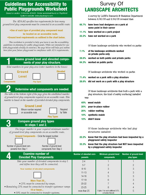 Since the number of ramps and transfer points are dependent on how many components and types of play equipment make up a play structure, the worksheet on the adjacent page has been provided to help you plan your play structure according to ADA regulations.