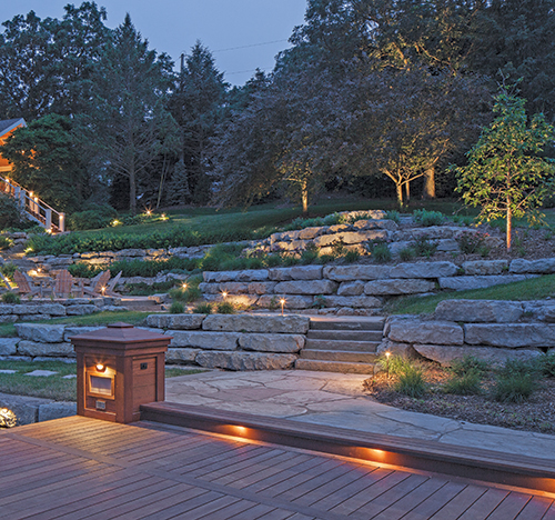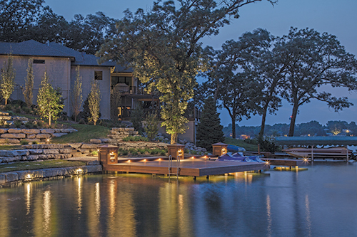 Though Nebraska calls to mind the rolling expanse of the Great Plains, the Cornhusker State is home to two sizable metropolitan areas, Lincoln and Omaha. The latter is the base of operations for McKay Landscape Lighting, Inc., which creates nightscapes for urban dwellers and rural residences alike, as the captivating installations in the next two stories bring to light. A spectacular vacation home on Beaver Lake, Neb., needed an overhaul to turn the backyard into a proper getaway destination for the homeowners. McKay Landscape Lighting, Inc., which had renovated the client's home lighting system (not the same client in the following story) worked alongside the landscape designer, architect and home remodeler to transform this countryside retreat. McKay was asked to craft a lighting plan to complement the landscape designer's vision for the property. The renovation required the removal of two white vinyl docks, which were replaced by two new docks with ipe wood decking, one for swimming and entertaining and another for boats. A white vinyl sea wall was also removed and replaced with a natural stone retaining wall more than 200 feet long, comprised of large limestone slabs 4-5 feet long, 2-3 feet deep, 12-14 inches thick and four slabs tall. The outdoor lighting covered all of the home's new exteriors, from the outside of the residence to the boathouse, seawall, outdoor firepit, docks, trees and vegetation. Getting It Wired After the natural stone sea wall was installed in the fall of 2012, installation of the landscape lighting took a three-man crew about 60 days to complete. The bulk of the construction was scheduled in two phases; in the winter of 2013, McKay installed the sea wall lights when the water level of the lake was low and frozen. The area and dock lights were installed in the spring of 2013, after the docks were completed, to coincide with the rest of the landscape installation. The homeowners typically use the residence from May through September.