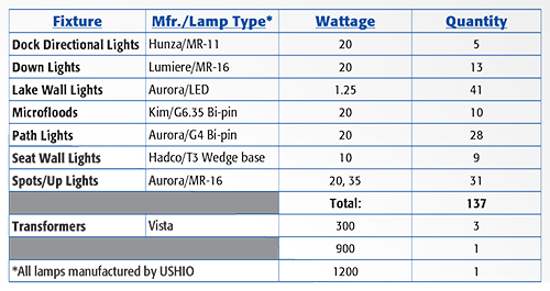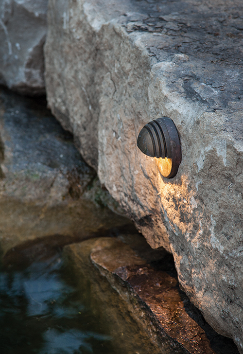Adding More Sparkle The other area of focus was the illumination of both docks. McKay's team added the same brass LED fixtures under the dock on the inside, illuminating the water and the interior of the boat ramps so the homeowners or visitors can guide their boats into the ramp at night. Two-inch stainless steel dock lights (Hunza) in the corners of the dock define the wood surfaces. The crew placed path lights in the landscape to identify walkways to and from the house, around natural stone steps and flagstone pathways. The transformers were concealed in ipe wood columns on the docks, which double as a location for speakers. The same round brass fixtures were installed under column caps to illuminate the columns, and McKay added copper seat wall lights (Hadco) under the dock steps that lead up to the natural stone pathways. All 137 landscape and area lights are tied together and are controlled by photocells and timers. Switches can also control the dock and lake wall fixtures, and one master switch at the house turns them on or off. "The owners had never used the property much at night, but now they do and love it," said Toby Paul, the project's lead architect. "The project's ironwood docks hover and the limestone seawalls glow [above] pools of shimmering water."