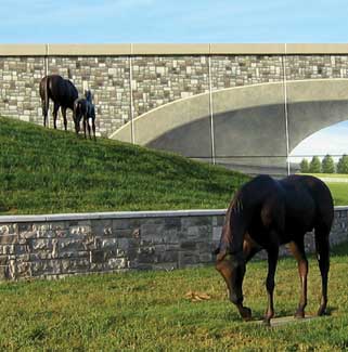 To the south, this work included the acquisition of adjacent properties, relocation of Parkers Mill Road, the relocation of Cane Creek at the confluence of the South Elkhorn Creek and the development of a new bridge crossing for Parkers Mill Road at the South Elkhorn Creek. To the north the project involved the development of an 800 linear foot retaining wall that gained a height of 30 feet adjacent to Versailles Road. The wall would be situated directly across from the Keeneland Race Course and the picturesque Calumet Horse Farm. Keeneland is a National Landmark and on the National Register of Historic Places and Calumet Farm is perhaps the most recognizable horse farm in the world. Versailles Road is considered one of the premier Gateways into the community. A Memorandum of Agreement (MOM) was established between the airport and the adjacent property owners. This agreement included participation in the design process and subsequent approval of the design by the City of Lexington, local farm owners, the Lexington Arts Council and the State Historic Preservation Office.