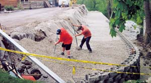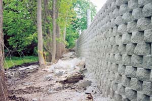 Two hundred and twenty feet of crumbling, bulging timber wall, plus more than 2,000 cubic yards of unsuitable backfill and debris were replaced with a Keystone modular concrete wall installed with engineered backfill. The wall ranges in height from zero to 14 feet. This project began late in the winter and was completed during the wettest May in our history. Special care was exercised to create a minimum of disruption, which pleased the tenants, and the project came in under the cost estimates, which certainly pleased the clients.