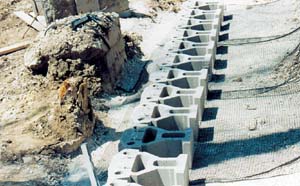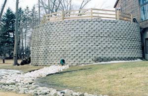 Each succeeding course was installed with a geogrid stabilizing fabric tied in every second course. At times, the geogrid fabric extended up to 16 feet. All backfill was compacted with a sheepsfoot compactor in six inch lifts. All work was checked during regular visits from our engineering firm; the municipal inspector and the owner were usually there on a daily basis also.
