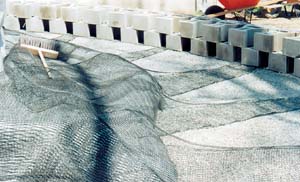 Next in order was the excavation of the area where the base of the wall would be located. Guided by an on-site engineer, we dug deep enough to reach suitable virgin clay soil. We further excavated to a depth which permitted a base of three feet of compacted traffic bond. Behind the base, we excavated to a width of 11 feet, running along the entire length of the wall. This was backfilled with number one clear (no fines) stone, compacted in six inch lifts. Upon that base, we installed the initial four courses of Keystone modular concrete wall system, tied back a minimum of 11 feet with Tensar GeoGrid stabilizing fabric, as prescribed by our engineering protocol. All of this base work is under the finished grade at the base of the wall, and approximately 6 1/2 feet below the original base of the failed wall.