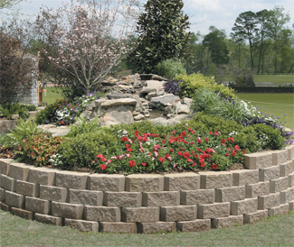 Water features complement outdoor living areas. They add a natural element that people are yearning for, and designers love them because of the increased creativity they inspire. Just imagine tranquil flowing water, brightly colored koi swimming lazily through clear pools, butterflies and dragonflies flitting about vividly colored water lilies and irises that contrast with lush greenery and ferns. It is easy to see why water features are such a hot commodity. The versatility of segmental retaining walls (SRWs) offers the landscape contractor the perfect vehicle to economically build these projects. Available in a wide variety of facing textures, shapes and colors, SRWs blend well with the natural beauty of the landscaping. The multi-piece Anchor Highland Stone, available in blended colors, is a good choice for water feature applications. Proper construction practices would include taking measures to avoid scour and erosion behind the walls, especially in areas of cascading or flowing water. With their tumbled appearance, they perfectly complement both concrete paving stones and natural stone while providing consistently sized shapes to facilitate construction of ponds, waterfalls, faux streams and fountains. By virtue of being relatively inert, concrete SRWs are environmentally friendly and will not introduce toxic chemicals into the environment or break down and decay over time.