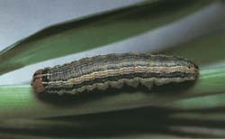 Early signs of armyworm feeding may appear as "windowpane" feeding on the leaves. When armyworms reach full size, they chew the stems and leaves of individual plants down to the crown. The "true" armyworm is a gray to greenish colored caterpillar with two pale-orange stripes along each side of their body. It is mainly a pest of small grains, row crops and pasture, but during heavy outbreaks, they move into turf once they have depleted their preferred food hosts. They generally occur in damaging numbers in spring.