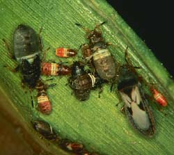 Immature chinch bugs can be recognized by the prominent white stripe that crosses the center of their body. The southern chinch bug is a severe pest of St. Augustinegrass grown along the Gulf Coast from Florida to Texas. It can also be found in southern California. The buffalograss chinch bug feeds only on buffalograss, and the "true chinch bug" feeds mainly on small grains corn and sorghum, and will only occasionally damage bentgrass, bluegrass, ryegrass, fescue or zoysiagrass.