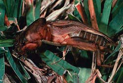 The greatest damage occurs when larvae feed inside the crown which then kills the turf. Damaged grass turns brown and dies typically in small spots, but larger areas can be killed. Once the larvae become too large to feed inside plants they move into the soil where they feed on roots before emerging from the soil as adults.