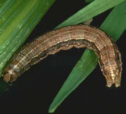 Armyworm is a term used for the caterpillar stage of various moths. These caterpillars are smooth skinned, robust caterpillars that measure about 1 1/2 inches when full grown, and tend to move in large numbers much like a marching army once they have depleted a food supply. There are a number of armyworm species that attack turf grasses, but the most common are the "true" or "common" armyworm, the fall armyworm and the lawn armyworm. Armyworms damage turf by chewing on leaves and stems.