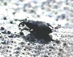 The larvae, if found in soil, are white bodied and have brown heads and do not have any legs. The adults are commonly found walking on turf and can be seen walking across sidewalks and driveways. Sampling for billbugs can include water drenches, which cause the adults to float out of the turf, or by removing the sod and examining the soil for the larvae.