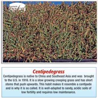 Centipedegrass?EUR??,,????'?????<??oe Centipedegrass is well adapted to most soils and climatic conditions in the south and upper south, but is not so well adapted to the more arid regions west of the Mississippi.