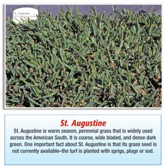 St. Augustine ?EUR??,,????'?????<??oe St. Augustine is a popular and widely used lawn grass in the humid coastal areas of the south from Florida to California. Its popularity is due in great part to having the greatest shade tolerance of the warm season grasses, while it also thrives in full sun. St. Augustine, which has a wider leaf blade than most other lawngrasses, is relative easy to establish by sodding or plugging with proper fertilization and watering, and will do well in most soil types. However, it is quite sensitive to freezing temperatures and winter kill; thus, limiting its use in the upper south. The available varieties vary greatly in their cold tolerance. Make sure the one you select has a good record of winter survival in your area before you buy. Also, only those varieties that are labeled as resistant to a disease called St. Augustine Decline (SAD) should be purchased.