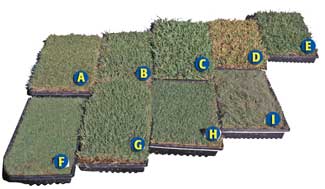 Legend: A. Zoysia matrella B. Zoysia japonica C. Perennial rye D. Kentucky bluegrass E. Texas bluegrass F. Colonial bentgrass G. Fine fescue H. Tall fescue I. Tall fescue J. Buffalo grass