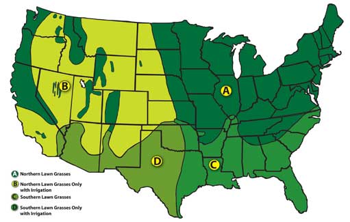 Many factors influencing the lawn are as important as temperature, such as proper drainage, protection from drying winds, mowing, fertilization, irrigation, proper grass species, etc. Thus, sorting out turfgrasses by hardiness zone is not so meaningful as it might be with other plant material found in the landscape. The type of map most often used with turfgrass adaptation is the one shown above, which identifies regions for Northern (cool season) grasses and Southern (warm season) grasses with and without irrigation.