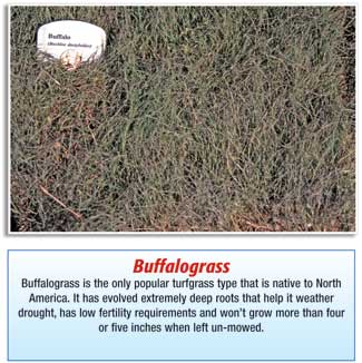 Buffalograss?EUR??,,????'?????<??oe This is the only turfgrass native to the North American plains from Texas to Canada. It has fine leaf blades that are blue-green in color, but will not develop as dense a lawn as other warm season grasses. There is a growing interest in buffalograss for low maintenance lawn areas. It can survive extreme drought conditions, has low fertility requirements, and generally will not grow more than 4 to 5 inches when left unmowed. However, buffalograss has little shade tolerance and does not do well in humid areas. Most of the new varieties are available only as sod, though a growing number are sold as seed.