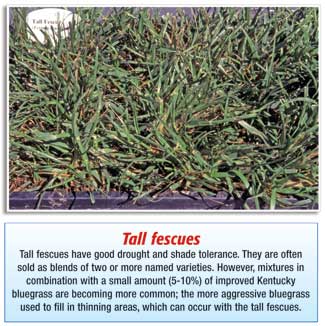 Turf type tall fescues have good drought and shade tolerance. They are often sold as blends of two or more named varieties. However, mixtures in combination with a small amount (5-10%) of improved Kentucky bluegrass are becoming more common; the more aggressive bluegrass used to fill in thinning areas which can occur with the tall fescues. Selecting the best grass for your lawn in the south depends primarily on two factors: how much sun your lawn will receive and its geographic location within the warm season grass region. The primary choices for southern lawns are: Bermudagrass, St. Augustine, centipedegrass, zoysia, tall fescue and buffalograss.