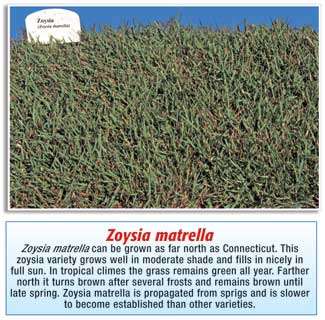 Zoysiagrass?EUR??,,????'?????<??oe Zoysia is not as shade tolerant as St. Augustine, but is considerably more tolerant of shade than Bermuda. Because zoysia is the most winter-hardy of the warm season grasses, it does better in the upper south regions and the transition zone. It is most often planted as sod or plugs, but it may take as much as two growing seasons for plugs to form a complete lawn cover. Once established, it has excellent wear tolerance and good drought tolerance.