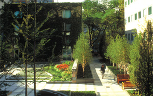 One of the major design considerations was that Balsley felt the paving should be constructed as a continuation of Kiley’s spirit and the spirit of his North campus design-simple, modernistic with geometric forms. In many cases they imported some of the materials and some of the same sorts of details of the north campus. That can be seen in the two different color granite pavements with stone ashlar walls and the allees of trees.