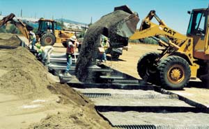 Construction started in May, 2000 by abandoning the existing sprinkler system in place and laser leveling and compacting the base surface. Rather than excavating out the needed 13 inch sand fill profile of ECS systems, the system was built over the existing soil by providing suitable perimeter containment for the sand fill. ECS technology incorporates unitized cell construction where a 30 millimeter thick underground liner pan prevents water loss to the subsoil, and the patented ECS pipe that controls the distribution of non-pressurized water in a defined pattern through gravity. The pipe also prevents sand intrusion into the chamber interior to prevent blockage. As in most modern athletic fields the fill material in ECS systems is washed sand. Through the creation of constant underground reservoir ECS systems rely on the capillary rise of water through sand to create a perfect moisture level for turf growth 10 inches above the water line.