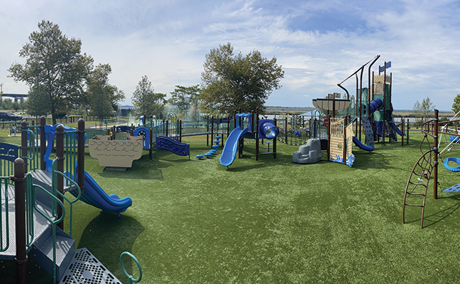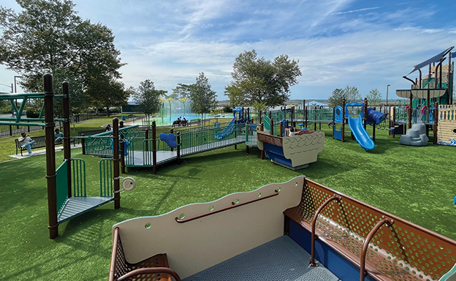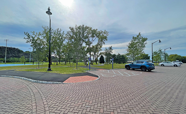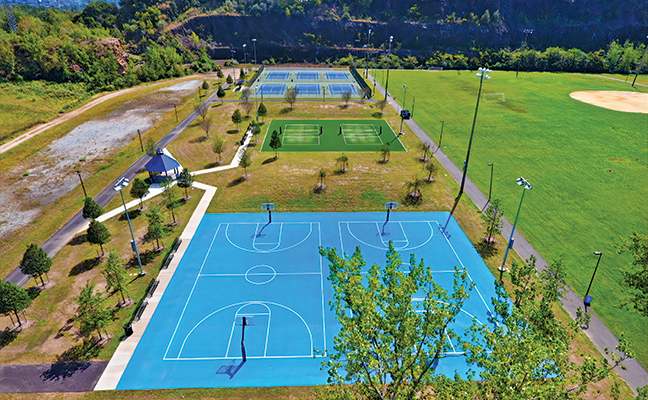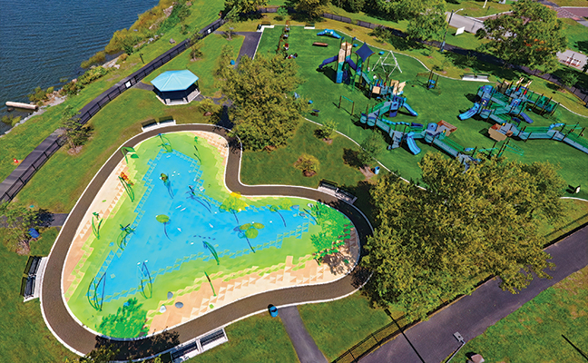 Hudson County selected Barreto / Dowd, Landscape Architects of Howell, New Jersey, for the park and recreation planning of Laurel Hill Park in Secaucus. The existing 67-acre park, which already hosted unique recreational opportunities for the public, such as the boat ramp and kayak launch, fishing pier, baseball and soccer fields, and cricket field, needed a redesign. The new and refurbished recreational facilities and Living Shoreline along the banks of the Hackensack River were funded in part by the State's Green Acres program with a $1.5 million grant and a $1 million loan with an approved construction budget of $7 million for Phase A and B. Phase A, recently completed in the fall of 2023, includes a sports courts area, 50-car permeable brick paver parking lot, lighting, landscaped paths, gazebo, playground, and sprayground. Phase B will include the shoreline restoration, permeable brick pavers at the existing gravel parking lots, roadway and path lighting, and park entry enhancements. Sports Courts Area Phase A added a sports court area with two basketball courts, six tennis courts, two volleyball courts, a 50-car permeable brick paver parking lot, a gazebo, paths, parking and path lighting, sports court lighting, landscaping, irrigation, and water quality basins. The multi-use path was designed to connect the new County High Tech School and adjacent high-density residential neighborhood with the park's new sports courts area and the existing park pathway system. The gazebo was specified as a shade structure centered amongst the new courts and features a bluestone floor with the county logo engraved in the center and a custom circular bench. Lighting New decorative LED roadway and pathway lighting flanks the new permeable brick parking area and the new paths. Roadway luminaries are a teardrop shape with arm brackets on tapered fluted poles. The 53 head lighting existing along the parking lots and roadways will be replaced with tear drop lights while 36 existing path lights are scheduled to be replaced with new matching decorative LED Franklin Park lights as part of Phase B. 600 sports courts luminaires were used on galvanized poles with a wireless control link system using an astronomical clock allowing the county to set an automatic schedule for controlling the lights.