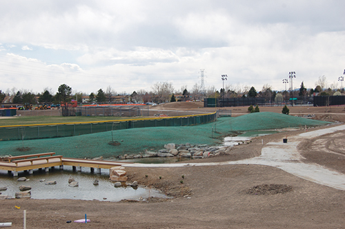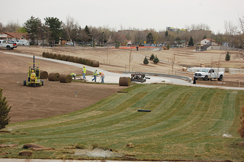 Excavation created a bowl near the center of the park, but the landscape design of rolling berms cleverly disguises the park's primary function of flood control. Once grading was completed, Colorado Designscapes planted a large conversation area within the 47-acre Utah Park with native grasses like Buffalo Grass, Blue Grama Grass, Sideoats Grama and Prairie June Grass.