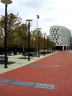 The formal approach to the athletic center is a paved street known as “O’Varsity Way.” Heading toward the athletic center, visitors are treated to a tree allee of Dynasty Chinese Elms. To the right of the tree allee is the O’Varsity Way paved walk. Engraved in this paved area are lyrics to the University of Cincinnati fight song. “The university really wanted to enhance the arrival experience to the village, for attendees to sporting events as well as prospective student athletes,” Manning said.