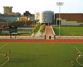 Due to the fact the campus is located in an urban setting, overlapping uses on site were essential. New tennis courts were built on top of an underground parking facility and a new practice gymnasium for the school’s basketball and volleyball teams was built three floors below ground inside the athletic center. Manning said sustainability was essential on this project, adding that site irrigation proved to be a substantial hurdle. “The drainage network was piped all over,” he said of the pre-project irrigation system. “The site drainage had to be reinvented, and a new central storage area for runoff had to be designed.”