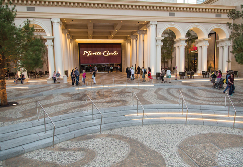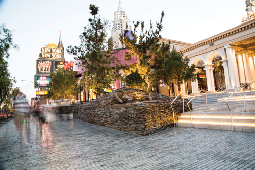 In 2012, MGM Resorts International launched a $500 million renovation project on Las Vegas Boulevard that is completely changing the pedestrian realm for the City. Plans include new Strip side experiences at the New York-New York & Monte Carlo resorts along with a public park leading to a new 20,000-seat arena. Exterior renovations in front of the two resorts, along with plazas and walkways, have recently been completed. The plazas feature casual bars, eateries and retail outlets. The park is currently under construction and will be the first public park in history along the Las Vegas Strip. It will feature open green space along with dining pavilions and performance venues. The hardscape elements were designed by !melk, a landscape architecture firm based in New York City. The total paving area is estimated at 500,000 square feet with an intricate design of marble and granite pavers supplied by Classic Stone and installed by Superior Tile & Stone. Richly textured marble cobbles were used for the hotel entrances and exterior surroundings and exhibit unique mosaic patterns in a spectrum of earth-tone desert colors. The pedestrian walkways were designed using marble bricks and are distinguished by a running bond pattern. The stair treads, risers and wall caps were finished with granite in a flamed finish to make them slip-resistant. The light colored stones complement the desert surroundings and maintain a high solar reflectance index to help retain less heat. Custom benches cut from large blocks of metaquartzite stone double as planters. The array of stones and patterns add visual interest and topographical variety to small spaces throughout the streetscape. Planters made of stacked stone cut from blocks of metaquartzite double as benches. Native and desert adaptive species of plants, including drought-resistant mesquite trees, agaves, and Mexican bush sage, were selected for the plantings. The granite stair treads have a flamed finish, helping make them slip-resistant. The variety of stones and patterns throughout the design were chosen to add visual interest and topography to the pedestrian area. The sand-set paver installation proved complex due to the detailed patterns and quantity of stone that needed to be installed each week in order to maintain schedule. With exceptional project management, timely material supply and highly experienced and efficient masons, the team was able to install nearly 2,000 square feet of pavers each day, meeting project production and installation deadlines. Native and desert adaptive species of plants and trees were specified throughout the project. Mesquite trees, agaves and Mexican bush sage are drought-resistant and will thrive in the dry, hot Vegas climate. A series of tulip-like shade structures are scattered throughout the development. The 60' tall structures will provide ample shade during the day and will emit LED sequences at night. Integrated low lighting was designed to allow the streetscape to function at night without competing with the signage and attractions of the casinos and hotels. The soft lighting creates a magical ambiance at night for strolling pedestrians and outdoor dining venues. The pedestrian walkways were designed with marble bricks, and are distinguished by a running bond pattern. The light color of pavers throughout the project was selected because of their high SRI, or solar reflectance index. With a lighter color, less heat is retained and the streetscape is kept cool. The pavers were installed with a sand-set installation: job-built edge restraints were placed first, followed by a base aggregate course with a minimum thickness of 9", then setting bed of sand and cement, followed by the pavers with a minimum of 5mm spacing. Sand was used to fill in the joints. The arena and the park are scheduled to open in 2016. The project is aspiring to achieve LEED Gold certification from the USGBC. MGM Resorts Park & Arena project is one of the largest privately funded public space construction projects in the United States.