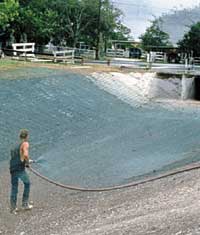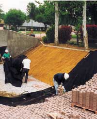 The geotextile underlayment (filter fabric) serves to retain and prevent most of the subgrade soil particles from migrating through the system and being transported downstream. It is a critical element in the overall ACB design process as it must provide the system with: bidirectional water permeability, soil retention and sufficient open area for the establishment of vegetative root growth through the fabric and into the under lying soils.
