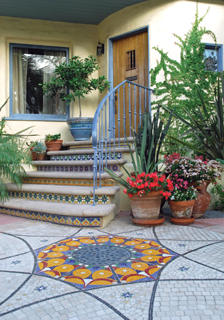 The Pattengill Residence, located in Kensington?EUR??,,????'?????<???(R)a suburb of San Diego, Calif., was completed in December of 2006. Construction involved two phases, including a front courtyard, which was completed first, followed by the pool and garden area at the rear of the house. The owners, who were artists by profession, were involved in every step of the project. They took this further than most homeowners and were involved in building pieces of the project as well. They tried their hand at glass mosaics and created a custom mosaic medallion that we installed in the center of the front entry courtyard.