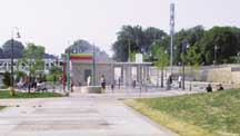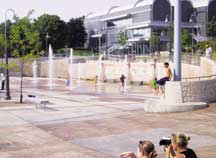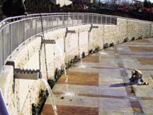 The interactive fountain plaza and children?EUR??,,????'???s spray pad is the centerpiece and first phase of the Forks of the Thames Revitalization Plan in London, Ontario, Canada. In 1998, London, Ontario, Canada adopted the Downtown Millennium Plan as a framework for the city?EUR??,,????'???s downtown revival. A key component was the Forks of the Thames Revitalization Plan, developed with the goal of making the downtown and Forks area a highly attractive and enjoyable place that would attract more residents and visitors. The Forks site was chosen because of its physical and historical relationships with the city and the Thames River. It is situated amongst some of the city?EUR??,,????'???s most significant buildings: the Labatt property, one of the first commercial buildings; Eldon House, the city?EUR??,,????'???s oldest residence; and the Middlesex County Courthouse, the original administrative building for the district. The Thames, which is in close proximity to the downtown, has a rich industrial history, including a former mill and millrace, and an association to the former White Sulphur Springs and Baths. Working with a consulting team led by PMA Landscape Architects, the City Parks Planning Department developed a master plan to encompass renovations to the more passive green space to the north (Harris Park), and the more intensely programmed site to the south (Ivey Park). Key improvements included a formal waterfront promenade; recreation trails and pathways; safe access points to the river; an amphitheatre for staged events; naturalized areas; a concession building; a children?EUR??,,????'???s playground and waterplay area; and an urban plaza. Incorporated into these spaces would be educational displays, and plaques and signage that narrate the environmental, historical, cultural and social aspects of the river and the Forks. DESIGN DEVELOPMENT OF THE URBAN PLAZA AND SPRAY PAD The first phase and highlight of the master plan included the design and development of the urban plaza and children?EUR??,,????'???s spray pad. For the detailed design stage, PMA was retained to lead a team of designers, including landscape architects and architects and civil, electrical, structural and mechanical engineers. The consulting team worked in close collaboration with the city planners, historians, and technical advisors. The site will provide an area for large crowds and seating, whether for spontaneously gatherings, or for special events, such as the annual fireworks display. It will also include a children?EUR??,,????'???s waterplay area. The theme of the site is the symbolic associations to the Thames River?EUR??,,????'???s Sulphur Springs and Baths by various interactive experiences with water. The site had a variety of access and grading challenges. The highest point and easternmost limit is the Middlesex Courthouse and parking lots, through which one point of entry was created. An existing grassy slope meets the groundplane of Ivey Park, approximately 6.5 meters below the edge of the parking lot. The design team aimed to provide fluid and fully accessible entries into the site from the downtown core. The threshold between the city and the Forks area had to be physically seamless, and yet visually make evident that one is entering a special domain. While the significant grade change from the city to the river proved challenging, it also provided opportunities for dramatic sequences and spaces. The design team deliberated how to resolve the grade change between the courthouse parking lot and the plaza. Several concepts were developed incorporating varying degrees of terracing and retaining structures. The simplest and most dramatic solution was to create a single, curved retaining wall to provide an overlook of the plaza and a panoramic view of the river. At a maximum 2.5 meter height, the wall would enclose the newly developed area that includes the plaza and children?EUR??,,????'???s splash pad. The material palette of the wall, the colored paving pattern, site furnishings, and lighting will combine to reinforce the uniqueness of the experience and site. INTERACTIVE FOUNTAIN PLAZA AND WATERWALL We encouraged unique relationships with water in a variety of ways. Water would be used at different volumes to heighten the sensory experiences via sound, sight and touch. It was a priority to ensure that people could access water and individually interpret associations with the river. In the overlook seating area, a water bench was designed to act as a seatwall and gentle waterfall. Rhythmic openings in the ?EUR??,,????'??seat?EUR??,,????'?? of the wall allow people to touch the gently flowing water. The experience of touching the water in a slow and meditative manner harkens back to the use of the Forks area as a sulphur springs spa. The water would continue through metal troughs embedded into the concrete walkway and reveal itself again in metal troughs cantilevered from the wall. The waterwall contains four pronounced waterfalls that spill directly onto the plaza surface. Strip drains were embedded discreetly into the paving along the colored bands of concrete. At the intersections of the colored bands are fountain jets programmed with a variety of jet styles and heights. Touch-sensor activators located at the terminuses of the retaining wall trigger the choreography of water, from the water bench to the water wall, to the fountain jets. The height and style of the fountain jets are determined by the number of times the sensor is activated and the amount of pressure applied. The duration of the fountain jets was calculated to match the approximate time it takes a person to walk from one sensor to the other. The plaza has a lively and ever-changing experience with water flowing, falling, and dancing. A bold sign that describes a historical synopsis of the Forks provides a backdrop to the display of water, evoking a feeling of celebration and pride. There is an elegant and civic quality to the 