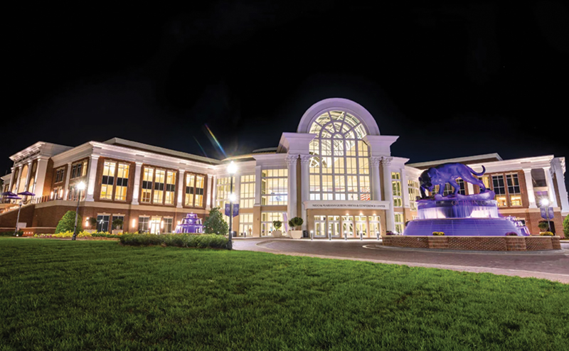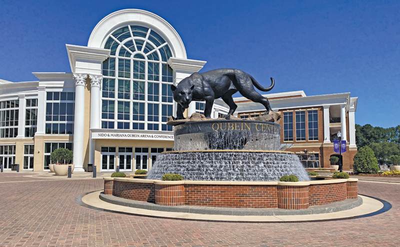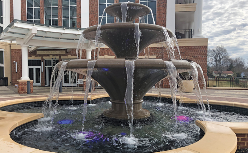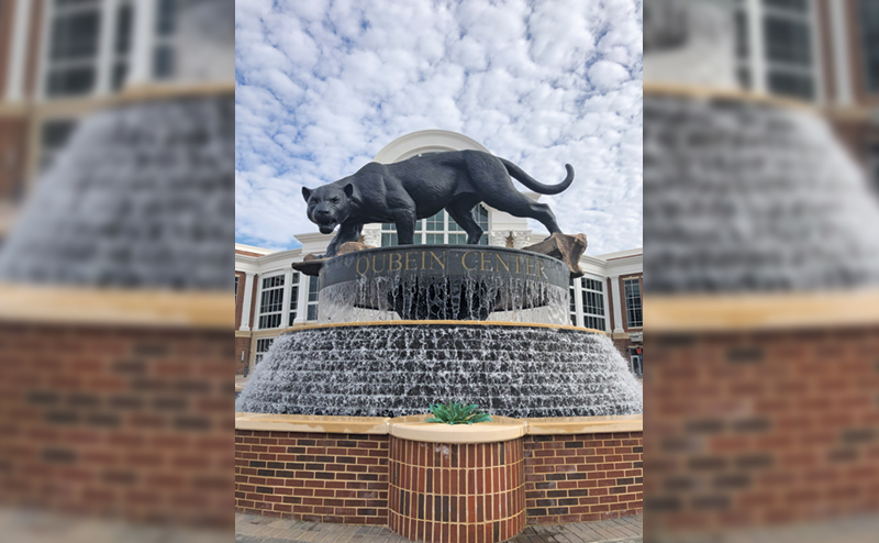 High Point University's Arena entry and hardscape needed a remodel, so LKC Engineering, an Aberdeen, North Carolina, landscape architecture firm, and Fountain People, Inc., a design and manufacturing company headquartered in San Marcos, Texas, was tasked with developing a tiered fountain, with cascading water from the upper to lower basins, strategically positioned LED lights, a 20-foot bronze sculpture of a panther, and two smaller fountains flanking the central fountain. The sculpture was designed by artist Brian Keith in collaboration with LKC Engineering. Project Overview Found in front of the Qubein Arena and Conference Center in High Point, North Carolina, the university sought to create an inspiring centerpiece that resonates with fans while aligning with the university's values, as part of a $170 million redevelopment of the arena, conference center, and hotel. Project Scope The Qubein Arena's circular, tiered panther fountain has a diameter of approximately 38 feet. At the top of the fountain sits a six-inch-deep upper basin and an 18' diameter that houses the panther sculpture platform. Water flows down to the intermediate pool basin, which has a diameter of 21 feet. From there, the water cascades down a series of steps to the lower basin before being returned to an equipment vault for filtration and recirculation. The panther design led the team to add a rock element to the fountain to create the effect of a panther standing on rocks with water flowing all around. Keith's unique 5,000-pound sculpture stands out among the many panthers represented on campus, as it is the athletic icon of the university.