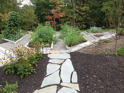 In October 2012, Superstorm Sandy devastated much of the eastern seaboard, causing $65 billion in damage across the East Coast. For these New Jersey homeowners, the destruction provided an opportunity for redesign. After several large trees were wiped out by the storm, Epic Land Design was called in to redo the landscape. The backyard renovation process proved to be defined by extreme weather conditions, taking just short of two years from the start of the design process to completion of the project. Getting Started The main goal was to create a usable backyard for the clients. Beyond the existing deck, the backyard sloped down 12 feet across a 30' span, leaving the backyard space unusable. After deciding against a pool, the homeowners chose to extend the deck to create a grill area with seating area, a large patio for lounging and entertaining, access from the deck to the yard, a vegetable garden, and landscaping for the woods area behind the house to screen the yard from a commuter train. The backyard work began in October 2013, a year after Hurricane Sandy swept the area. First, Epic Land Design installed the terraces, patios and walks. Approximately 90 tons of 2' to 4' boulders were installed, creating the terraced area and increasing the grade about 8 feet. The two boulder walls are each 80' long and used over 600 yards of fill soils. Additionally, Epic Land Design installed a 60' long, 20" tall dry stacked ADK stone seat/retaining wall. The new terraces exposed the foundation, so 40 square feet of natural stone veneer was used to fill in the gaps. The extended patio areas included space for lounging and entertaining. The homeowners already had a barbecue, so Epic Land Design created the new space for it. A new paver path connects the driveway, garage and back entry to the deck and patio with a flowing walk through the landscape. A flagstone path was constructed to lead to the new semi-formal vegetable garden. The township has a 15 percent impervious coverage maximum, so the patio and paths had to be carefully planned to account for this. Weather Strikes Again The 2013-2014 winter for New Jersey was the harshest the state had seen in several years, with double the usual snowfall. The harsh weather slowed the project as it was just getting started. A brief warm spell in December 2013 allowed Epic Land Design to install the deck footings, but since the majority of the work area was where the sun would not melt the snowpack, work came to a halt from then to March 2014. After spring was reaching its end and the snow finally melted, work progressed slowly until June, as the six-person crew had to split their time between this extensive hardscapes project and regular spring residential operations. Once work was back in full swing at the start of summer 2014, the deck was modified, and landscape lighting and irrigation added.
