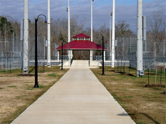 The baseball/softball fields are sodded and have an automatic irrigation system. At the center of each baseball quad, a covered pavilion is provided. Design elements and materials from the concession building are repeated in the pavilions. These pavilions are raised approximately four feet to allow visitors to sit and view the games. Ceiling fans are provided to improve the comfort level of the visitors. A 10-foot wide plaza is provided around the pavilions and small bleachers are built into the sides of the plaza behind home plate. Around the pavilion plaza, Drake elms (Ulmus parvifolia) are planted to provide shade to the plaza and the bleachers. Grass areas are provided along the baselines fences for folding chairs or movable bleachers.