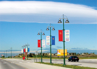 A wide range of lamppost styles from Whatley were used including the HYde Park 314 and Dublin 354 series in various heights. Project design required distinctive luminaire and lamppost coordination between W.J. Whatley and Architectural Area Lighting (AAL). Lamppost and luminaire configuration with single and double luminaires adorned with spring loaded banner brackets provide lighting and aesthetics for roadway arterial streets and residential areas.