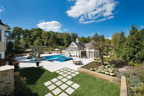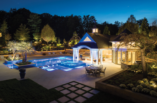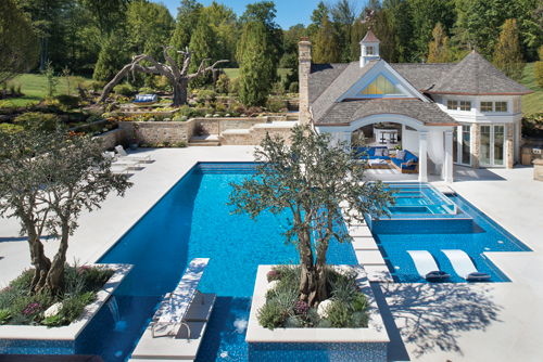 The hot tub has an infinity edge on all four sides, and a holding tank underneath the pool area replenishes the spa with warm water whenever people enter and exit the spa. Cloonan also said the pool area has a sophisticated "gutter system." Water from the spa won't comingle with the cool water from the swimming pool, even though it appears the two are connected. Landscape lights and 28 LEDs were installed in the pool area. "They create an amazing light show," he said. Step and rope lighting lend a resort-type feeling to the backyard, and outdoor lights accentuate the whole landscape even more. "Subtle, yet powerful," he added. The building process was challenging, though, as Cloonan's client wanted the pool done before the short summer season ended. Work began in December 2014. "We dug the pool in January, and we had record cold temperatures," Cloonan said. "We built tents and heated them over the pool and masonry. But my team rose to the occasion, and we finished in late July." "It has a very unique and outstanding look," he said. "The tree just puts an exclamation point on this entire project. It's really out-of-the-box." Project Team Project Landscape Architect: Patrick Cloonan Construction Manager: Cloonan Design Services Inc. Pool Contractor: High Tech Pools Cabana Architect: Joe Myers Architects Cabana Builder: Riviera Construction Interior Designer: Jane Frankel Interiors Landscaper: S & M Landscape Construction Inc. Tree Fabricator: Nature Maker Lighting: RDT Sales Sound: RadioActive Electronics Masonry: D&M Masonry Plumbers: Taylor Plumbing Electrician: Kennington Electric Concrete: Keselman Construction Excavator: Moauro Construction Inc. Glass railing: Finelli Architectural Iron & Stair Co. Swing: Dedon Inc.