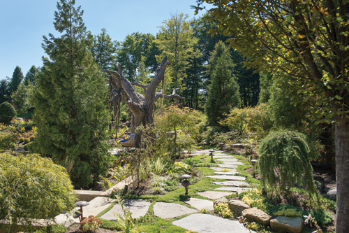 After a brainstorming session, Cloonan and his team came up with a novel idea. "Let's build a tree," he said. And that's what they did. "I started by drawing a concept of the tree and then found someone to build it," Cloonan said. "After 10 pages of design and 38 pages of engineering "?u we did it!" "The tree was not part of the scope of the work in the beginning," he said. Cloonan, whose company will celebrate 25 years of business in 2016, said he wanted this tree to look like some of the sprawling, massively large oaks found in the South. The trunk weighs 1,400 pounds, and the branch that the swing is suspended from weighs 1,100 pounds. He complemented the tree-and-swing section of the back yard with a pathway made of bluestone steppingstones, lined with 300 ferns, multiple varieties of Japanese maples, perennials and tropicals, and sedum ground cover. "We also set a back drop using 25-foot cryptomeria "Yoshino' cypress trees and carpinus trees, which we purchased at TDH Nurseries in Maryland," Cloonan said. All of these elements give the backyard a "whimsical" sort of look, Cloonan said. "It put the icing on the cake to this project," and set it apart from all others he has done to this point. The tree even has a "happy face" etched in it. "They call it "The Watchman,'" he said. Nature Maker, a California company, built the fake oak tree out of steel and fiberglass, as well as two smaller olive trees for the pool area. Cloonan and his clients had to wait a few months for the trees to be completed and trucked to the site. Cloonan's clients wanted a "California" look to their back yard, so the pool is contemporary and features floating steppingstones, complete with a hot tub that looks like glass but is actually acrylic. "To be kid friendly, we kept the diving board, and set it in the pool on the steppingstones," said Cloonan, who has a degree in landscape architecture from Ohio State University. The steppingstones are made of limestone that had been sandblasted. "Finding white stone was a challenge," he said, " but white was important to pull off the California contemporary look."