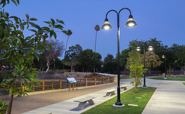 Wilderness Park is located just south of Florence Avenue between the 605 Freeway and the San Gabriel River in Downey, California. An SCE high-power transmission line runs overhead along the west boundary of the site. Residential housing flanks the east side of the park as it tapers down in size and extends southerly. The popular San Gabriel River Bike Trail runs adjacent to the park and along the river on an elevated levee. The park has been a popular passive escape for residents and visitors for over five decades. Heavy use and "loved-to-death" wear at the park prompted the City to include the renovation of Wilderness Park in their successfully supported City Bond with additional funding from the Rivers and Mountains Conservancy and a Habitat Conservation Wetlands grant. Design Program, Intent, and Scope The two ponds, as the major draw to the 20-acre park, significantly influenced the renovation scope of the project. Their condition was poor with leaking liners, eroding turf edges, inaccessible and worn-out shorelines, and thickened sludge-like bottoms. The filter and circulation systems were taxed year-round. The intent was to redesign the ponds to improve water quality; introduce a more riparian edge that is habitat friendly to wildlife; and enhance the pedestrian experience with meandering walks, bridge crossings, overlook decks, and convenient viewing benches. Expansive turf areas were converted to drought-tolerant shrub and groundcover areas to attract birds, butterflies, and pollinators. Our scope of services included preparing a renovation concept plan, design development, construction documents, and construction support services. Materials and Installation Methods