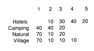 Amougis loaned us a film started by the Greek Tourist Organization that had not been completed. It was aimed at improving and selling tourism in Halkidiki, and it illustrated the coastline of the three peninsulas, showing campgrounds, modern-hoteis, villages, the monasteries of the third peninsula, Mt. Athos, and long stretches of undisturbed beach. As the film had not yet been given a soundtrack, it offered the opportunity of comparing the visual amenities. It was shown to an audience of landscape architecture students at Cal Poly University, Pomona, who were asked to rate the four scenic types depicted in the film: camping areas with minimal facilities, resort hotels with all luxuries, natural landscapes without modification to the beach and fishing villages, and monasteries. Using a five-point system (one being excellent, five terrible) the following data was recorded: (rounded percentages)
