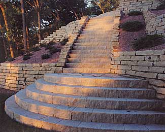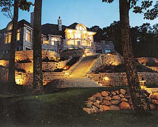 Lighting the entire stone wall surface helped to de-emphasize the house, one of the clients?EUR??,,????'?????<???EUR? objectives. The natural stonework on the house is subtlety adorned with less foot-candles than the retaining wall system. The shadows and highlights of the natural characteristics of the retaining wall system become a focal point on an evening stroll to and from the lake.