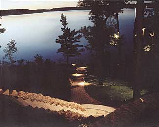 In 2003, Vande Hey and company completed a lighting installation for a vacation home perched on a 130-foot slope held in place by an extensive retaining wall system. Looking like a castle looming over the lake, the installed lighting guides visitors along a network of stairs and paths and marks the home as a distinctive landmark among the pines.