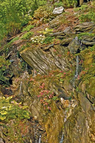 The Berkshires in western Massachusetts are a popular retreat for travelers from far and wide. The area is a summer home to the Boston Symphony Orchestra, Berkshire Theatre Festival, Berkshire International Film Festival, Jacob's Pillow Dance Festival, the Norman Rockwell Museum and Shakespeare and Company. While the arts opportunities are diverse and plentiful, the bucolic ambiance and rolling hills of the Berkshires are equally enticing. Nestled in the Berkshire Mountains is a private residence near Great Barrington, Mass. – named the best small town in America by Smithsonian magazine – whose owners have lived in the Berkshires for many years. Valerie Winig, RLA, principal of Wingate, Ltd., (Wingate) often assists her clients with landscape architecture design, though her firm is primarily a retail home furnishings store and interior design showroom. Such was the case with this property. Winig took on the project when the client asked her to oversee the project's landscape architecture after working as the client's interior designer. When Wingate became involved with the project, the residence had been built, the spa and pool placed, and the arborvitae around the pool area planted. Additional site development was incomplete beyond a desire for a rock outcropping near the residence to become a naturalized waterfall.