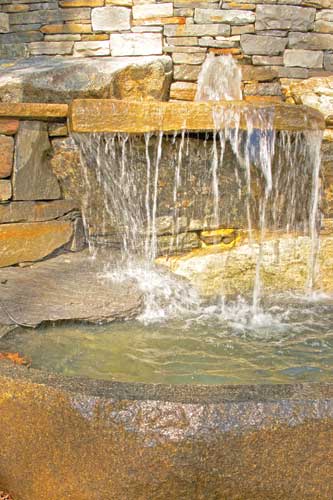 Water Features Wingate's first design decision led to the displacement of an enormous rock structure in the middle of the rear yard. The rock formation, a hollowed-out oval approximately five feet in diameter, was relocated to the top of a rock outcropping. The reconstituted structure was transformed into a wishing well that doubled as the origin of the new waterfall. Conceptually, the water – containing any wishes made at its source – leaves the wishing well and makes its way over the rock outcropping waterfall, dips below grade and reappears at the pool fountains, spa and lower pond area below. A safety fence around the pool area and a walkway to the rear were incorporated through the proposed lawn terrace when the water design was complete. The walkway was placed immediately adjacent to the stone retaining walls directly beneath the residence, enabling the terrace to maintain its expanse.