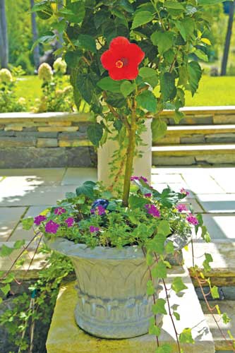 Plants Working with the client and Mountaintop Landscaping, Wingate specified plant materials for the property. The client's love of lavender was introduced in the form of Lavandula Hosta, Annabelle hydrangeas and Russian sage. Dogwoods, crabapples and an edge-defining boxwood in several locations created multi-seasonal appeal and maintain an extremely clean and formalized setting, in contrast to the natural theme in the adjacent spaces. The waterfall area was planted by Mountaintop Landscaping and filled with hostas, sedums and thyme, and cut leaf dwarf Japanese maples punctuate the connections between the retaining walls and the rock outcropping. The site development was enhanced by Tom Whalen of Whalen Nursery, Inc., Egremont, Mass., who placed large-caliper deciduous and evergreen trees throughout the project. Fifty-three 12'–13' dark American arborvitae were installed around the pool in total, creating a backdrop for the trellis and lounging area, designed and built by Wingate. Specimen trees that the owner requested for other areas were field-approved and positioned on site by Wingate and planted by Whalen Nursery.