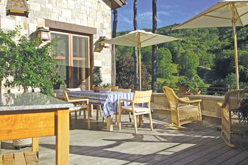 The residence's architecture is now fastened to the land via stone retaining walls, appropriately scaled exterior rooms, terraces and plant material. The security fencing for the pool is obscured with careful placement beyond the evergreens and atop the ha-ha retaining wall below the terrace. Wingate also used Haddonstone freestanding planters aged with "stonage mix" to match the naturalistic theme. Outdoor residence side terrace furniture and umbrellas were from Janus et Cie, and poolside and terrace furnishings beneath the waterfall were provided by Brown Jordan.